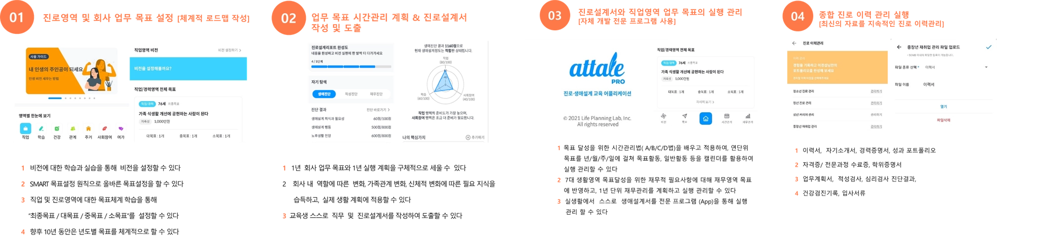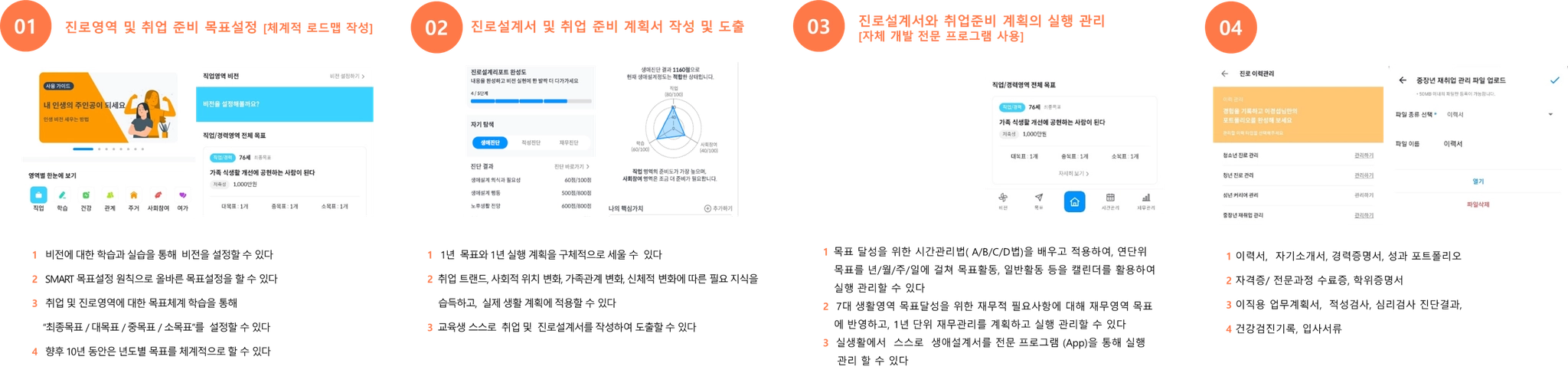 진로설계에 대한 이해, 전용 프로그램 사용법, 인생 비전설정, 비전 실현을 위한 장기 목표설정, 직업&커리어 영역에서의 목표 달성을 위한 시간관리 방법