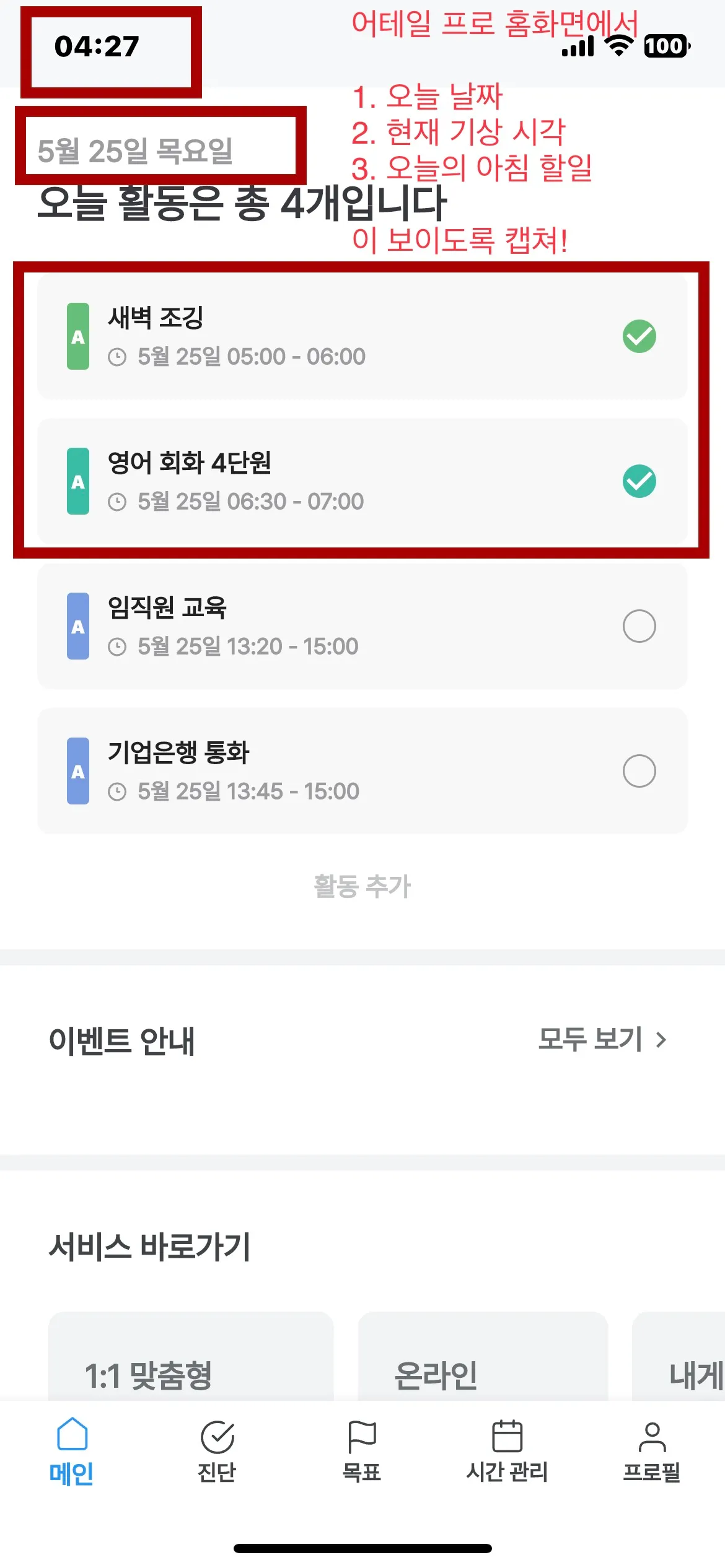 2) [필수] <어테일 프로> 홈화면에서 a) 오늘 날짜 b) 현재 기상 직후 시각 3) 오늘 아침의 할 일이 함께 나온 화면을 캡쳐해 주세요.