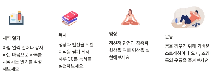 아침 일기, 독서, 공부, 명상, 운동 등 나를 발전시킬 수 있는 어떤 것이든 좋아요!